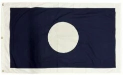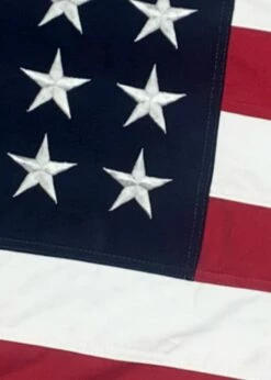 First National style battle flag of the 10th Texas Cavalry. This flag is a reproduction and is designed to look as much like the original as possible and is also the same size as the original flag that was carried into battle by the 10th Texas. This flag features fifteen appliqued stars that are outlined with heavy embroidery. The eleven white stars arranged in a circular pattern represent the eleven secessionist states with one larger star in the center representing Texas, while the four red stars are arranged in the four corners of the canton and represent four of the five civilized Indian tribes that sided with the Confederacy. It is unknown why the Seminole tribe is not represented on this flag. The lettering is embroidered and visible on both sides of the flag but readable from one side only. Made of 2-ply polyester which is the most durable option for outdoor use.