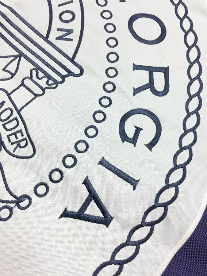 The 1956 (second) Georgia State flag consisted of the Georgia State Seal on the left-hand or hoist-side of the flag and a square Confederate battle flag on the fly-end or right-hand side. This flag served as Georgia’s official state flag from 1956 – 2001. The embroidered lettering on the seal is visible and readable on both sides of the flag.