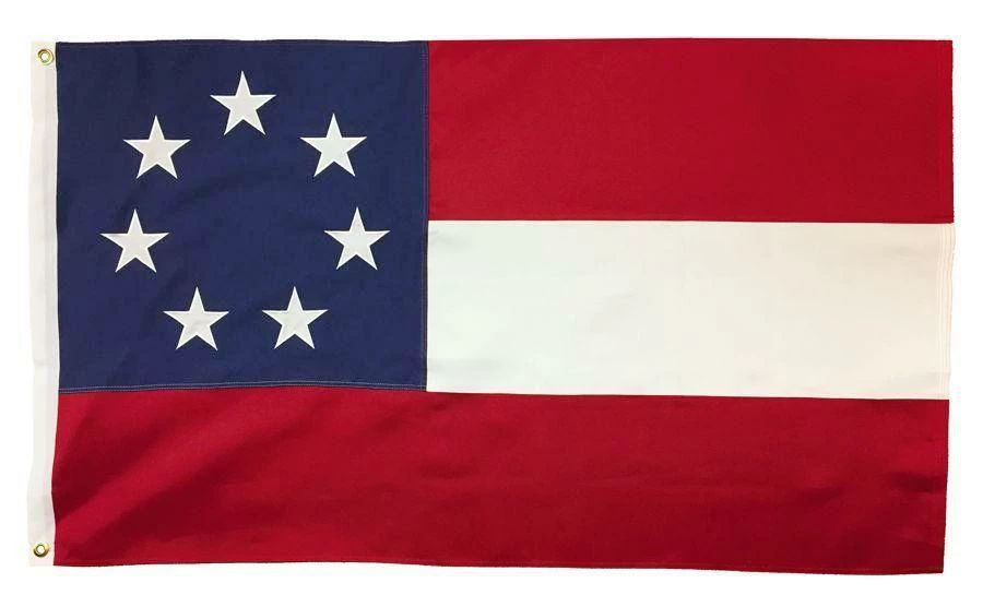Fully sewn heavy-duty polyester First National Confederate flags. Two-ply polyester is the most durable option for those who fly their flag 24/7. These flags feature beautifully appliqued and embroidered stars and sewn panels with rich, vibrant colors.