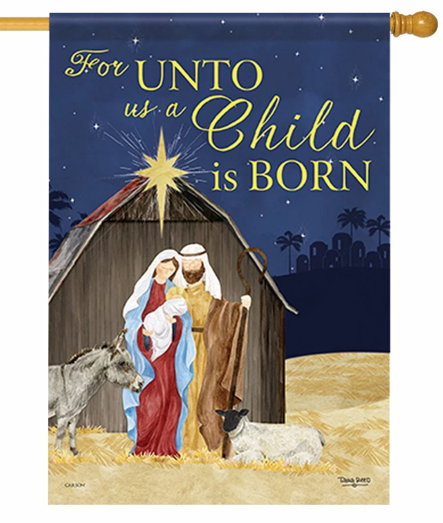 “For Unto us a Child is Born” is a wonderful house flag depicting Mary, Joseph and baby Jesus just outside of the manger with a few of the manger animals all under the Star of Bethlehem. This house flag can be displayed at your home, work, or for church services. The lettering reads correctly on both sides of the flag.