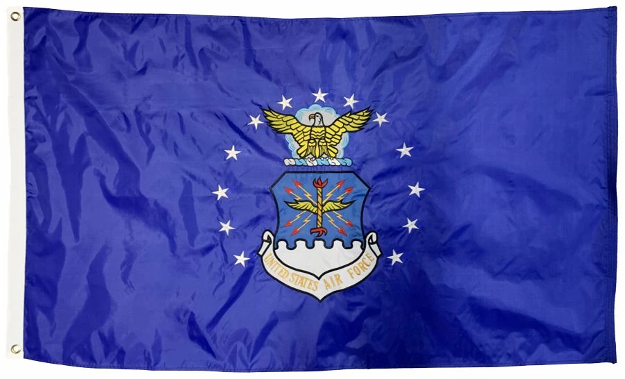 This official US Air Force flag design was adopted by President Harry S. Truman on March 26th, 1951, and consists of the official United States Air Force Crest and Shield which itself is comprised of a halo of 13 stars around the Department of the Air Force’s coat of arms. The 13 stars represent the original 13 colonies, while the 3-star grouping at the top represents the three departments of defense. The crest also includes a North American Bald Eagle, which is the US National bird. The cloud formation depicts the formation of a new firmament. This flag features double-sided construction with two separate 150-denier nylon flags sewn back-to-back with a liner in between to prevent the images on one side from showing through to the other. The embroidery work appears on both sides of the flag and the lettering reads correctly from both sides as well.