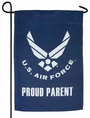 This United States Air Force “Proud Parent” garden flag features the official Air Force Wings logo centered on a deep blue background with white lettering. “U.S. Air Force Proud Parent” reads correctly from both sides of the flag.