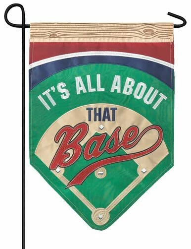 Baseball diamond-shaped garden flag with detailed embroidery and applique artwork and lettering against a background that simulates a baseball field with a wooden bat across the top for added effect. The embroidered “It’s All About That Base” message reads correctly from both sides of the flag. Hang this cool, fun flag up around your place for a few laughs and a great conversation piece for the baseball fans.