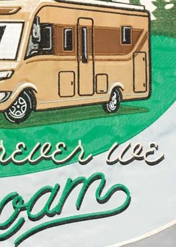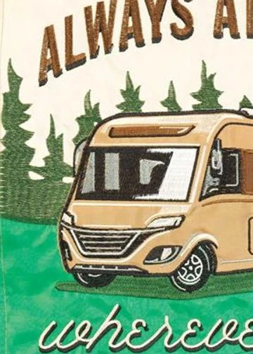 “Always at Home Wherever We Roam” double applique house flag is great for those who are always on the go. Beautiful stitching throughout with lots of detail. This will look great in the campground, your current RV park, or at the beach. The wording reads correctly on both sides of the flag.