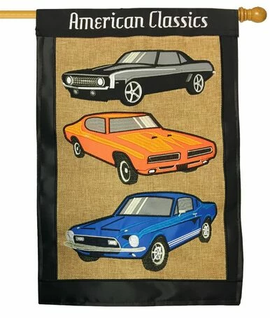 This 1968 Camaro, Pontiac GTO, and Shelby Mustang-themed house flag, features masterfully crafted embroidery and applique work, beautifully capturing the likenesses of these awesome machines against a rugged-looking, burlap textured background. The embroidered “American Classics” lettering reads correctly from both sides of the flag.