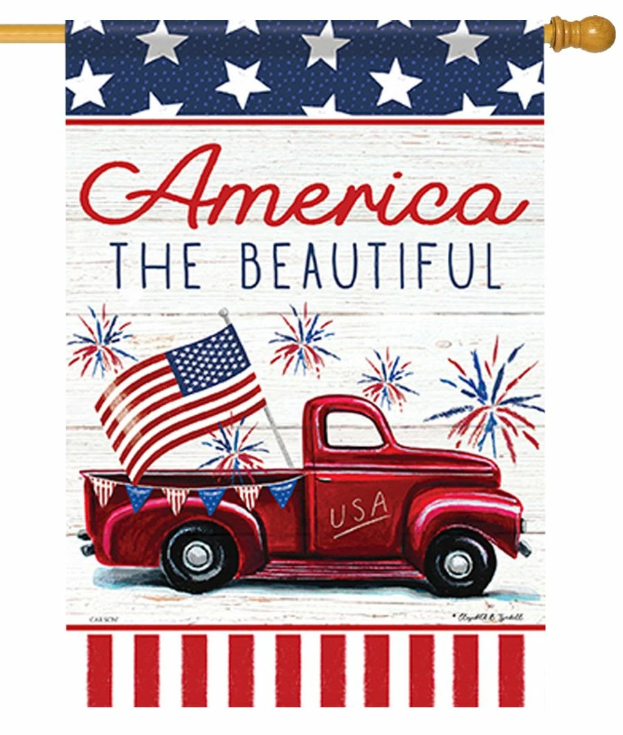 This Americana patriotic antique pickup truck house flag is perfect for Independence Day with its stars and stripes theme and the fireworks appearing in the background. The artwork is visible on both sides of the flag and the “America the Beautiful” lettering reads right on both sides as well.