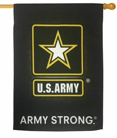 This Black and Gold Army Strong House Flag features a bold black and gold Army Star logo centered on a super cool looking background that starts out solid black at the outside edges and fades to a dark grey toward the center. The repeating words “US ARMY” are subtly watermarked into the background in black lettering becoming more visible toward the center as the background color becomes lighter. All lettering reads correctly from both sides.