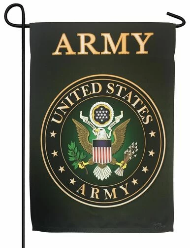 This Green and Gold United States Army Seal Garden Flag features a US Army, green logo centered on a super cool-looking background that starts out dark green at the outside edges and fades to a slightly lighter green toward the center. The repeating words “UNITED STATES ARMY” are subtly watermarked into the background in dark green lettering becoming more visible toward the center as the background color becomes lighter. All lettering reads correctly from both sides.