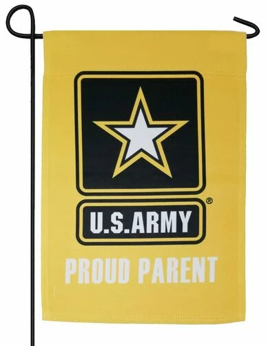This United States Army proud parent garden flag features a black and white Army Star logo centered on a rich gold background. “US Army Proud Parent” reads correctly from both sides of the flag.
