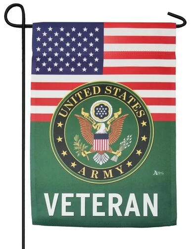 This United States Army Veteran garden flag features an American flag on the top half of the design and a green background on the bottom half with the U.S. Army seal in the center. The words “United States Army” on the seal and “VETERAN” below the seal read correctly from both sides of the flag. The blue starfield of the American flag appears on the top lefthand side regardless of which side the observer is viewing it from.