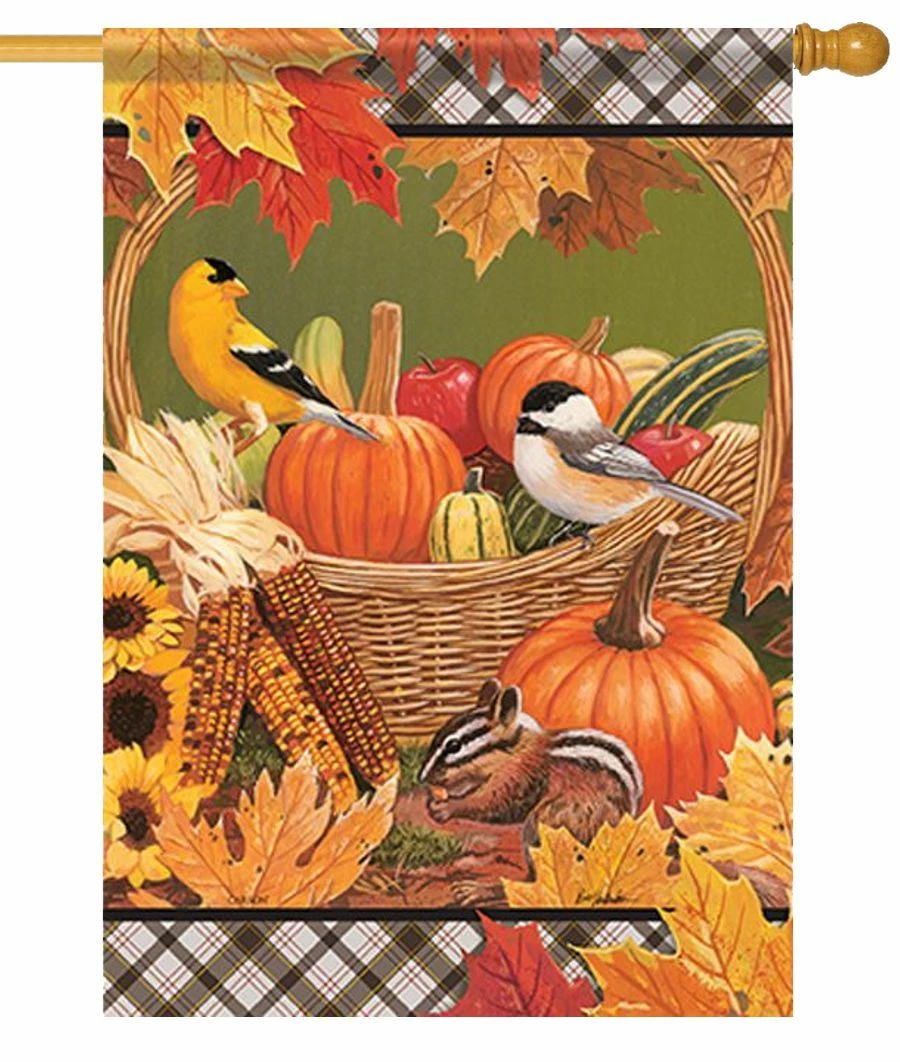 Enjoy the pleasures of the fall season with this decorative house flag. The image shows a straw basket filled with pumpkins and autumn leaves. A chickadee and an oriole perch along the sides of the basket. Sunflowers, autumn leaves, and a small chipmunk fill the foreground. The image on this decorative garden flag is a gorgeous way to celebrate the fall season.