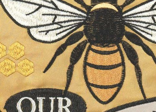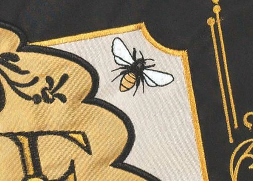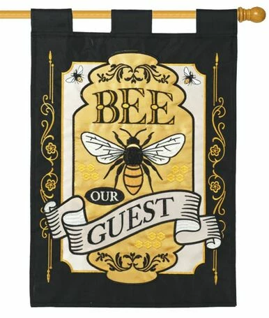 This classically designed, busy bee, double applique house flag features beautifully detailed embroidery and applique work depicting a nice, big bee against an ornately designed, vintage signboard style background. The embroidered “Bee Our Guest” message reads correctly from both sides of the flag. Hang this beautiful, rich looking flag at your Home or business to make your visitors and guests feel welcome.
