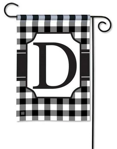 This letter D monogrammed garden flag shows a bold letter “D” against a white background, framed with an ornate border and a fashionable, black and white checkered background. The artwork and the letter are visible on both sides of the flag, and the letter reads correctly on one side only. Dress up your Home or business in stylish fashion with this hot design.