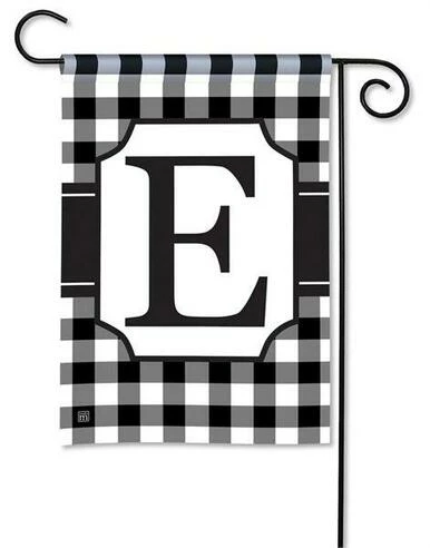 This letter E monogrammed garden flag shows a bold letter “E” against a white background, framed with an ornate border and a fashionable, black and white checkered background. The artwork and the letter are visible on both sides of the flag, and the letter reads correctly on one side only. Dress up your Home or business in stylish fashion with this hot design.