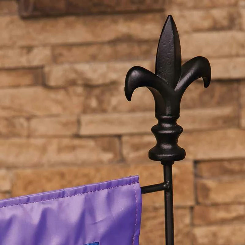 Black garden flag-stand with decorative, three-dimensional Fleur de Lis finial. Display your favorite decorative, seasonal, team, state, or any other garden flag just about anywhere with this attractive Fleur de Lis garden flagpole.