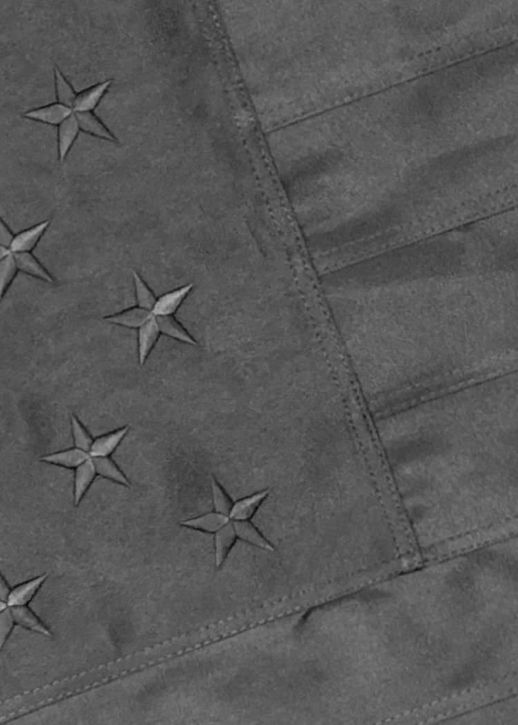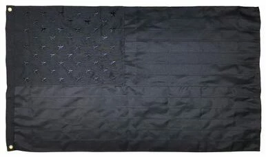 Solid black flags have historically been used during warfare to signify that no quarter will be given to enemy combatants. Although the US military has never practiced such brutal tactics, this all-black flag has been fashioned in the pattern of an American Flag with beautifully embroidered stars and sewn stripes and is intended for novelty use only.
