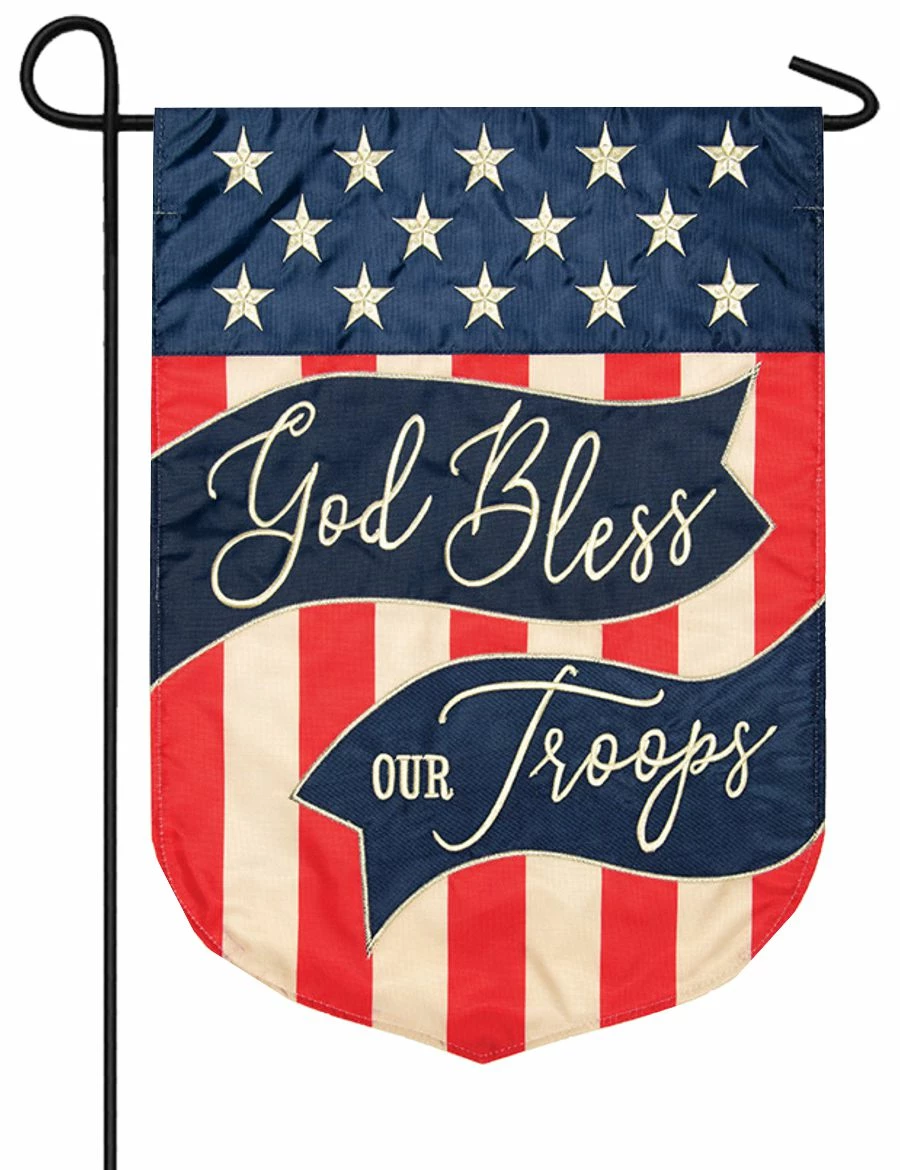 “God Bless Our Troops” what a beautifully stitched garden flag to put outside of your home or business to show your love and support for those who defend it. This garden flag can be used for military homecomings or any patriotic-themed event. Readable on both sides.