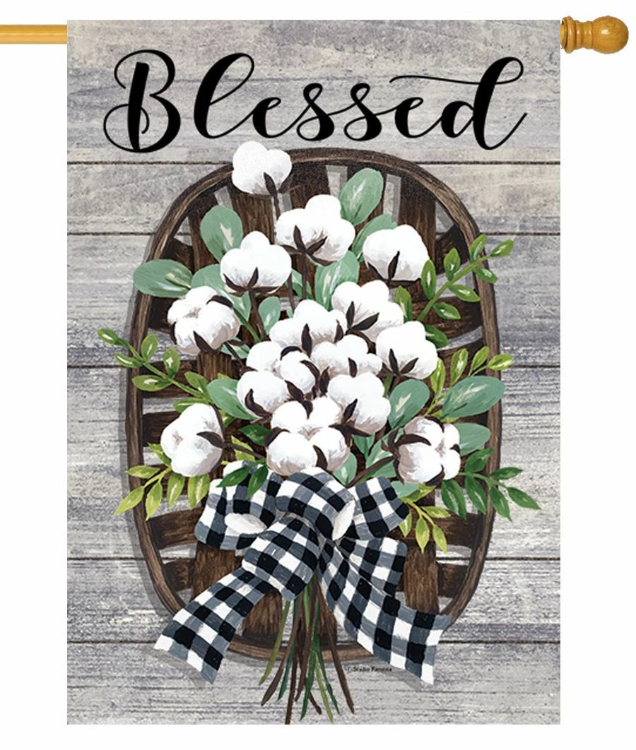 When you see every day as a gift, you’ll want to share it with others by displaying this decorative house flag. The artwork depicts a bouquet of cotton boles tied up with a black and white checked ribbon. The bouquet is set against a basket and a weathered wooden wall backdrop. The message across the top reads, “Blessed” in black script. The message reads correctly from both sides. The message on this decorative house flag shares the joy of each day with everyone. Artwork by Tina Wenke.