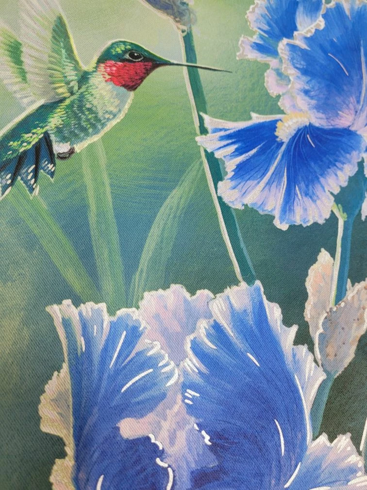 Display this beautiful hummingbird garden flag outside of your home, garden, or “She Shed” this spring. It’s always exciting when the Iris are in full bloom and your yard has feathered friends. They are such a delight to watch while sipping your coffee. The metallic foil accents added to the iris petals and outlining the hummingbird will shimmer and shine in the sunlight or moonlight.