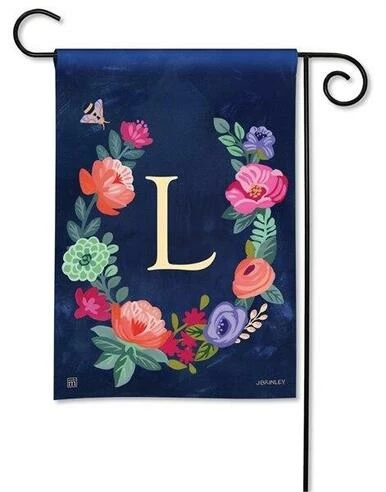This letter L monogrammed garden flag shows a bold, crème colored letter “L” against a rich, blue background, framed with a gorgeous, fashionable floral wreath. The artwork and the letter are visible on both sides of the flag, and the letter reads correctly on one side only. Dress up your Home or business in fresh fashion with this sophisticated design.