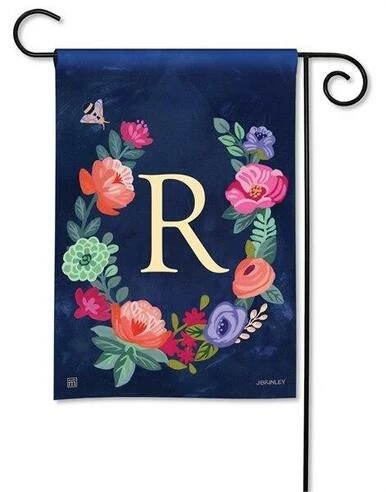 This letter R monogrammed garden flag shows a bold, crème colored letter “R” against a rich, blue background, framed with a gorgeous, fashionable floral wreath. The artwork and the letter are visible on both sides of the flag, and the letter reads correctly on one side only. Dress up your Home or business in fresh fashion with this sophisticated design.