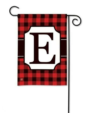 This letter E monogramed garden flag shows a bold letter “E” against a white background, framed with an ornate border and a fashionable, black and red Buffalo check background. The artwork and the letter are visible on both sides of the flag, and the letter reads correctly on one side only. Dress up your Home or business in stylish fashion with this rich, warm design.