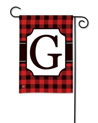This letter G monogramed garden flag shows a bold letter “G” against a white background, framed with an ornate border and a fashionable, black and red Buffalo check background. The artwork and the letter are visible on both sides of the flag, and the letter reads correctly on one side only. Dress up your Home or business in stylish fashion with this rich, warm design.