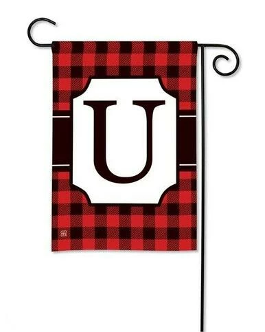 This letter U monogramed garden flag shows a bold letter “U” against a white background, framed with an ornate border and a fashionable, black and red Buffalo check background. The artwork and the letter are visible on both sides of the flag, and the letter reads correctly on one side only. Dress up your Home or business in stylish fashion with this rich, warm design.
