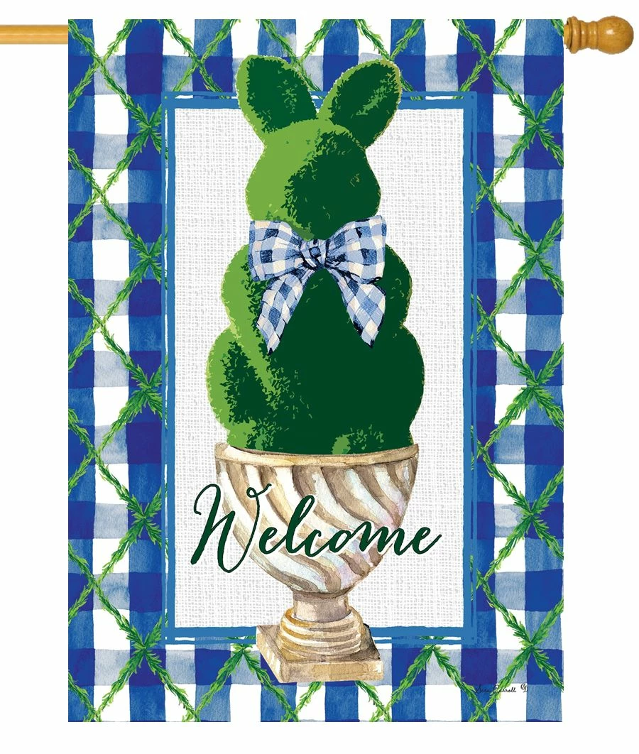 “Welcome” guests with this beautiful and elegant Bunny Topiary House Flag. The blue, green and beige colors go wonderful together. This will look outstanding outside of your home or business. The lettering reads correctly on both sides of the flag.