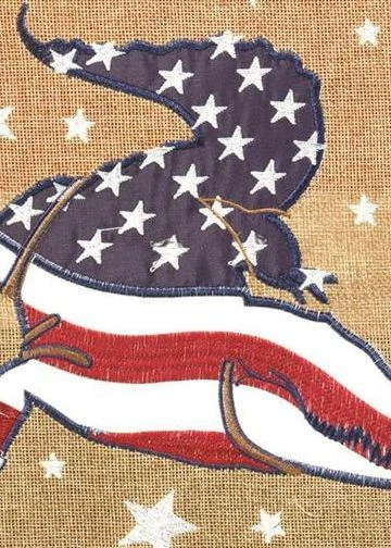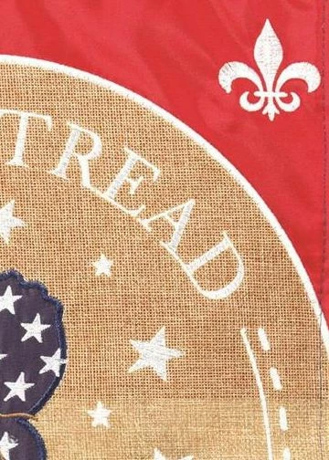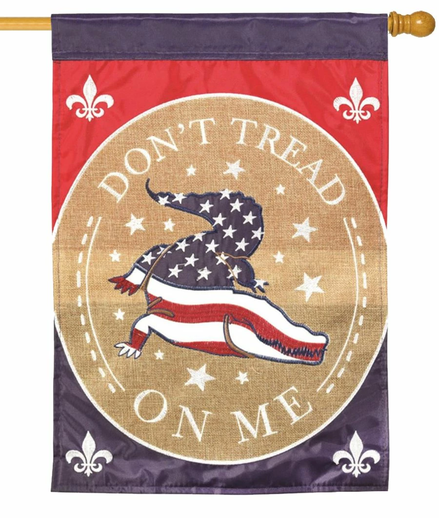 This patriotic alligator Louisiana-style house flag features beautifully embroidered artwork that appears on both sides of the flag and an embroidered “Don’t Tread on Me” message that reads correctly on both sides as well. The rugged burlap background perfectly contrasts with the bright red, white, and blue colors.