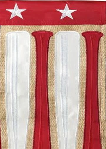Celebrate America’s favorite pastime in patriotic fashion with this bats and balls Americana-themed double applique house flag. The bats are arranged in the stripe pattern while the balls represent the stars of an American flag. All of the details are appliqued, embroidered, and fully sewn, and appear on both sides. This flag will add a real home run to your outdoor or even indoor patriotic sports-related decor.