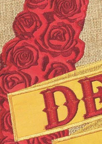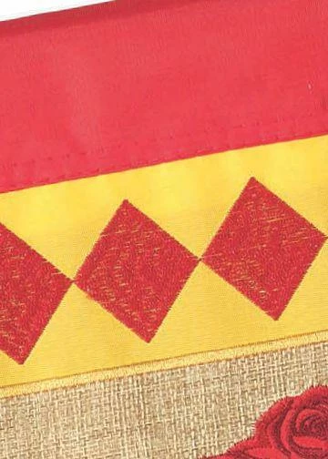 This burlap and applique, Derby Time garden racing themed house flag features beautifully embroidered and appliqued details against a rugged looking, burlap textured background. The horseshoe shaped, rose wreath is embroidered with deep red colored stitching that contrasts nicely against the textured backdrop. The “Derby Time” lettering reads correctly from both sides of the flag.