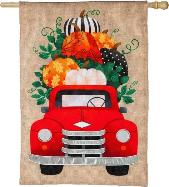 Featuring a red vintage truck piled high with patterned pumpkins this burlap decorative house flag really stands out. With silver metallic accents on the truck’s bumper and guard, the design celebrates the fall season. The material is both fade and weather resistant so that it will stay beautiful for many years to come.