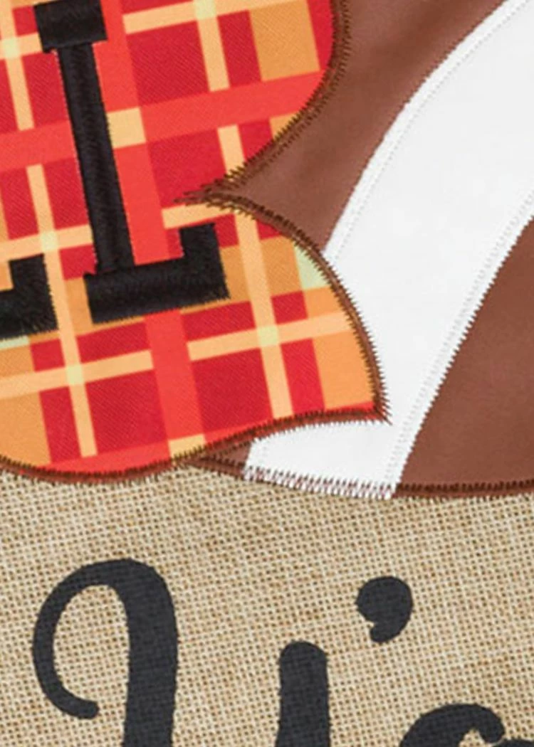 Double-sided, embroidered burlap garden flags by Custom Decor. The textured fabric looks like real burlap but is actually a polyester blended fabric that is highly weather-resistant and durable, so you get the fashionable look of burlap with the durability of polyester. The artwork is embroidered and appliqued onto two separate panels and then sewn together, back to back for a double-sided, rich-looking, luxurious flag with a very high-end appearance. Fits on any garden pole. Flag size 12″ x 18″.