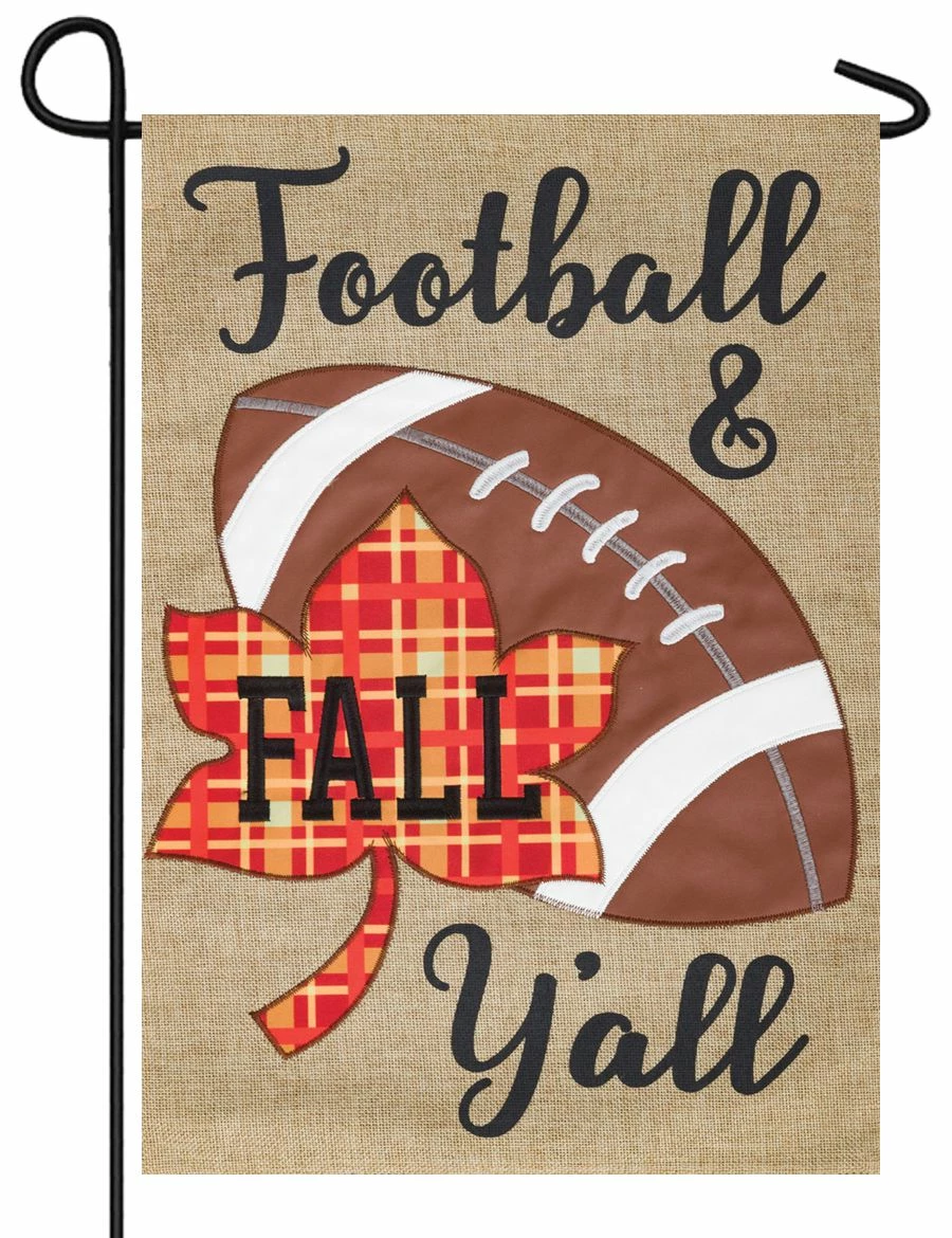 Fall means football season. Share your love of the sport with this decorative garden flag. The center of the flag is a large football and a red and yellow plaid leaf. The message reads above, “Football &” in black lettering. The message continues on the leaf, “Fall”, in black lettering. The message continues at the bottom, “Y’all” in black letters. The lettering reads correctly from both sides. For football lovers, this is the perfect decorative garden flag.