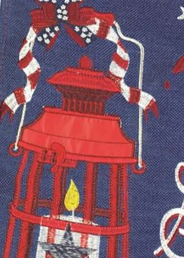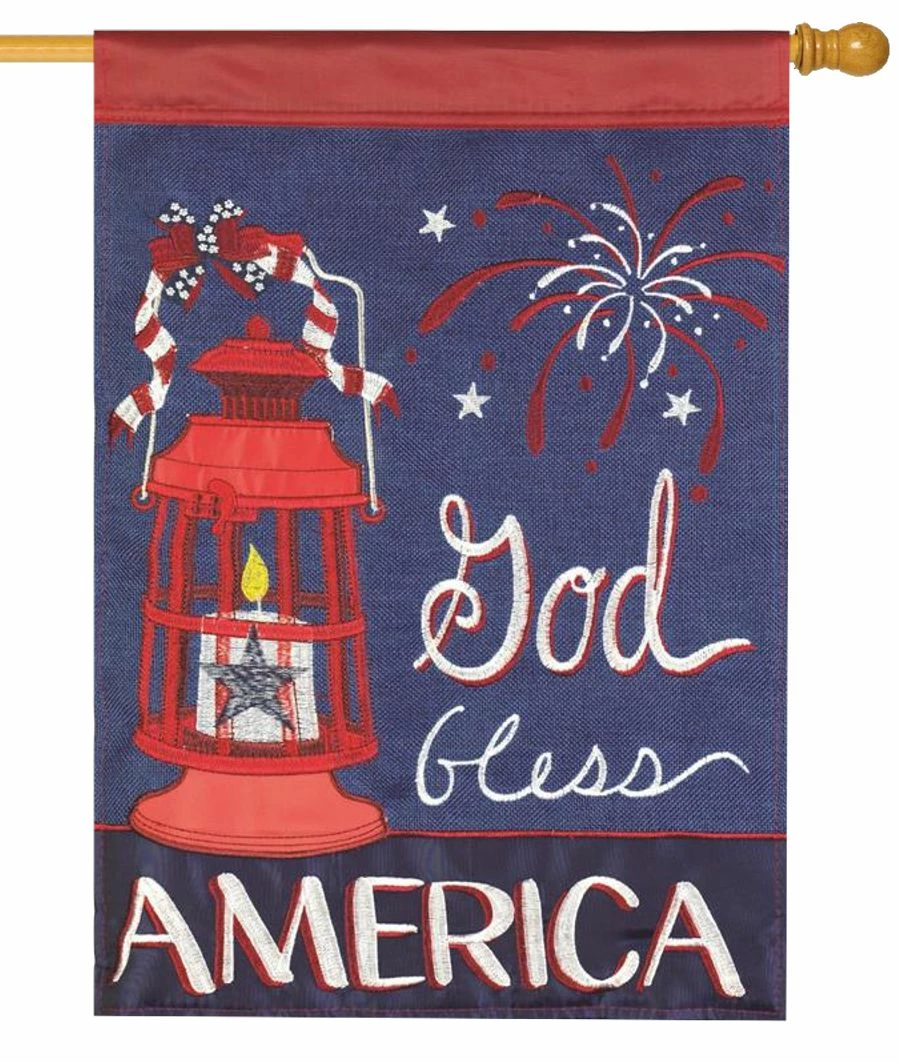 “God Bless America” is on colored burlap to indicate a night sky with a lit lantern. Affixed to it is a designer ribbon while fireworks are going off in the background. This house flag is beautifully detailed with wonderful stitching throughout. This is the perfect flag for the Fourth of July at your home, business, or any patriotic event. The wording is correct on both sides of the flag.