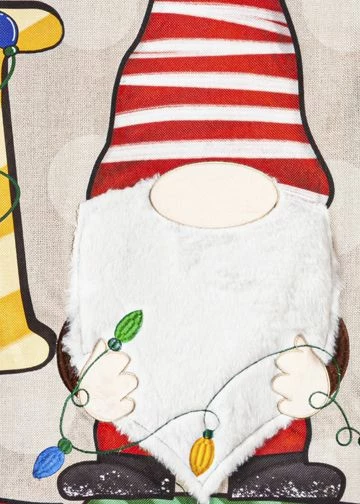 “Home” Gnome is ready just in time for the holidays. This cute little fella with his three-dimensional nose and beard is prepping for the holidays by wrapping his multi-colored and multi-patterned home with colorful lights. This adorable house flag will look great outside of your home! The lettering is correct on both sides of the flag.