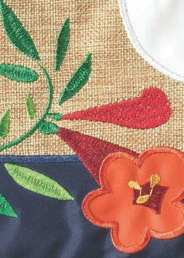 The delicate shades of orange, red, and green stand out beautifully against the rugged burlap background of this hummingbird themed garden flag. The dark blue top and bottom borders add a touch of tasteful fashion to this gorgeous flag while the stunningly detailed embroidery and applique work make this rich looking design a real conversation piece to hang up around your Home or business for the spring and summer seasons.