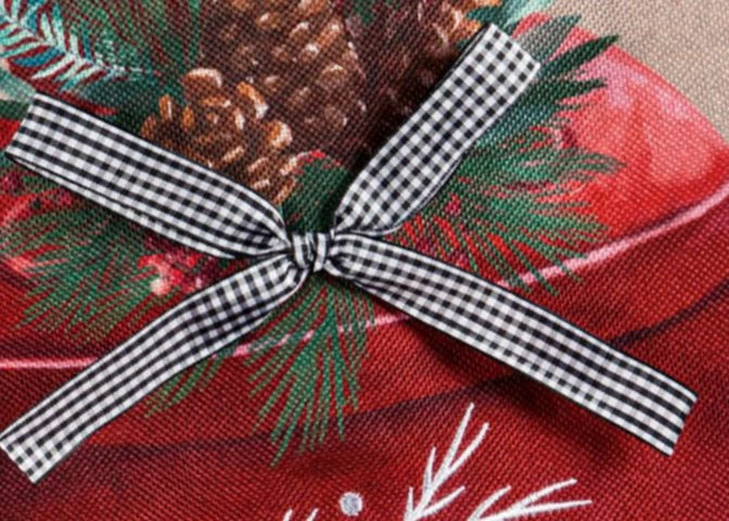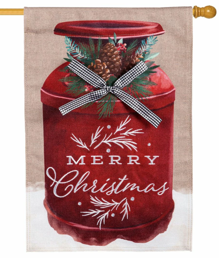 Decorate for Christmas with true vintage style with this decorative house flag. The artwork shows a red vintage milk jug sitting in the snow against a beige background. The message reads on the body of the jug, “Merry Christmas” in a white script and lettering. The neck of the jug is tied with pine boughs, pinecones, and checked ribbons. The lettering reads correctly from both sides. This is a decorative house flag that delivers a country image of days gone by.