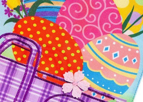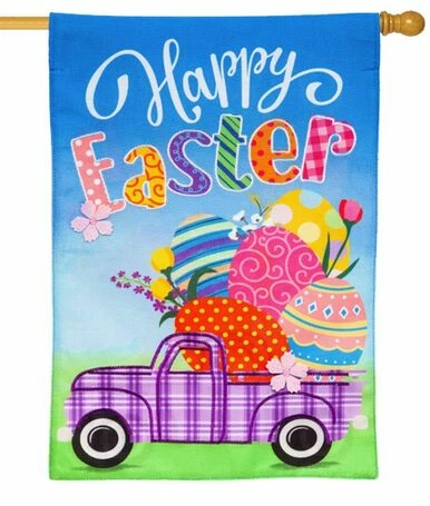 Easter celebrations and color come together in this decorative house flag. The image depicts a purple and white plaid vintage truck. The bed of the truck is filled with large, decorated Easter eggs. The image is set against the green grass in the foreground and the blue sky in the background. The message reads, “Happy” in white script while the message, “Easter” is spelled out in fun, decorated letters. The lettering reads correctly from both sides of the flag. This decorative house flag is a cute way to celebrate the Easter season.