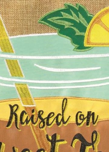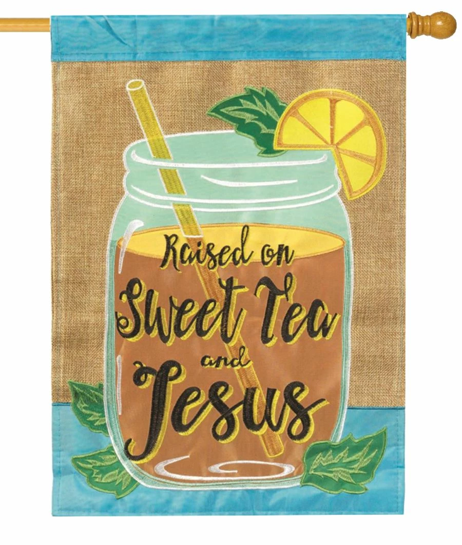 This burlap “Raised on Sweet Tea and Jesus” is a very nicely stitched heavy house flag. If you’re from the South, you understand that you always have an ice-cold glass of sweet tea, and Jesus is never far from your mind. Please see our close-up pictures for views of the details. Readable on both sides.