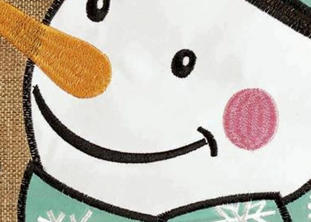 Welcome the winter season with this fun decorative house flag. The artwork depicts a snowman with his stick arms raised in the falling snow. The snowman is wearing a black top hat with a blue band that has snowflake motifs. Around his neck is a blue scarf with the same snowflake motifs. The snowman has rosy cheeks. The artwork is set against a beige background. The image is visible from both sides. This iconic snowman decorative house flag is sure to bring smiles to both your young and older visitors.