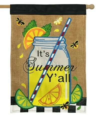 Summer fireflies and lemonade jar, decorative house flag featuring a Mason jar with lemonade, fireflies, and an embroidered “It’s Summer Y’all” message that reads correctly from both sides of the flag. The amount of detailed embroidery and applique work on this super cool-looking design is quite amazing. The burlap background makes the beautiful, bright colors stand out. What an eye-catching, gorgeous flag to display at your Home or business for the summer season.