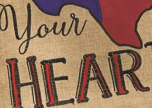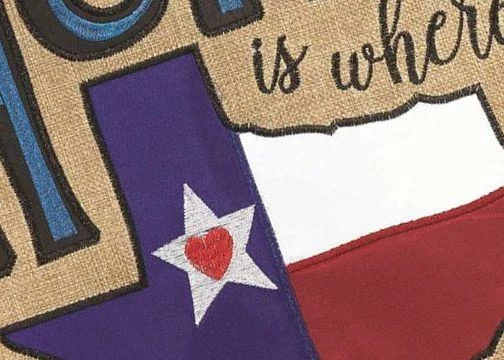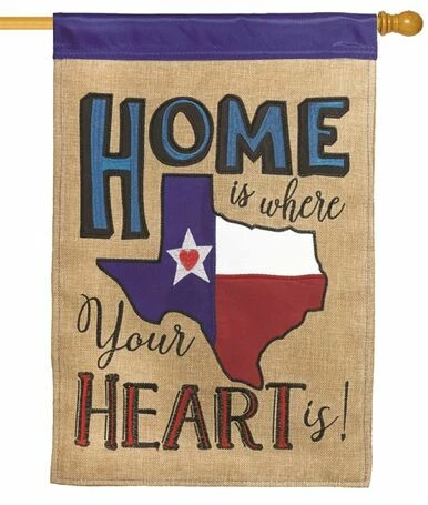 Show your Texas pride with this decorative house flag. The message reads, “Home is Where the Heart Is” in blue and red accented letters. The message surrounds the shape of Texas with the state flag imposed on it. The background is beige. A blue border runs across the top. The lettering reads correctly from both sides. Whether you were born in Texas or got here as soon as you could, this decorative house flag shows everyone how much you care about your state.
