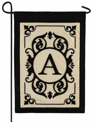 Elegant, decorative monogram garden flag featuring a smartly designed monogram letter “A” sewn onto a crème colored, nylon fabric background and surrounded by ornate scroll work. The letter and the scroll design are both appliqued using a thick polyester material that looks and feels like felt. The four fleurs de lis in the corners of the design are heavily embroidered, while the entire design is framed with a black nylon border. All of the artwork is double sided so the letter reads correctly on both sides of the flag. What a rich looking, personalized touch to add to any outdoor landscape or indoor décor. Fits on any garden pole. Flag size 12.5″ x 18″