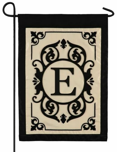 Elegant, decorative monogram garden flag featuring a smartly designed monogram letter “E” sewn onto a crème colored, nylon fabric background and surrounded by ornate scroll work. The letter and the scroll design are both appliqued using a thick polyester material that looks and feels like felt. The four fleurs de lis in the corners of the design are heavily embroidered, while the entire design is framed with a black nylon border. All of the artwork is double sided so the letter reads correctly on both sides of the flag. What a rich looking, personalized touch to add to any outdoor landscape or indoor décor. Fits on any garden pole. Flag size 12.5″ x 18″