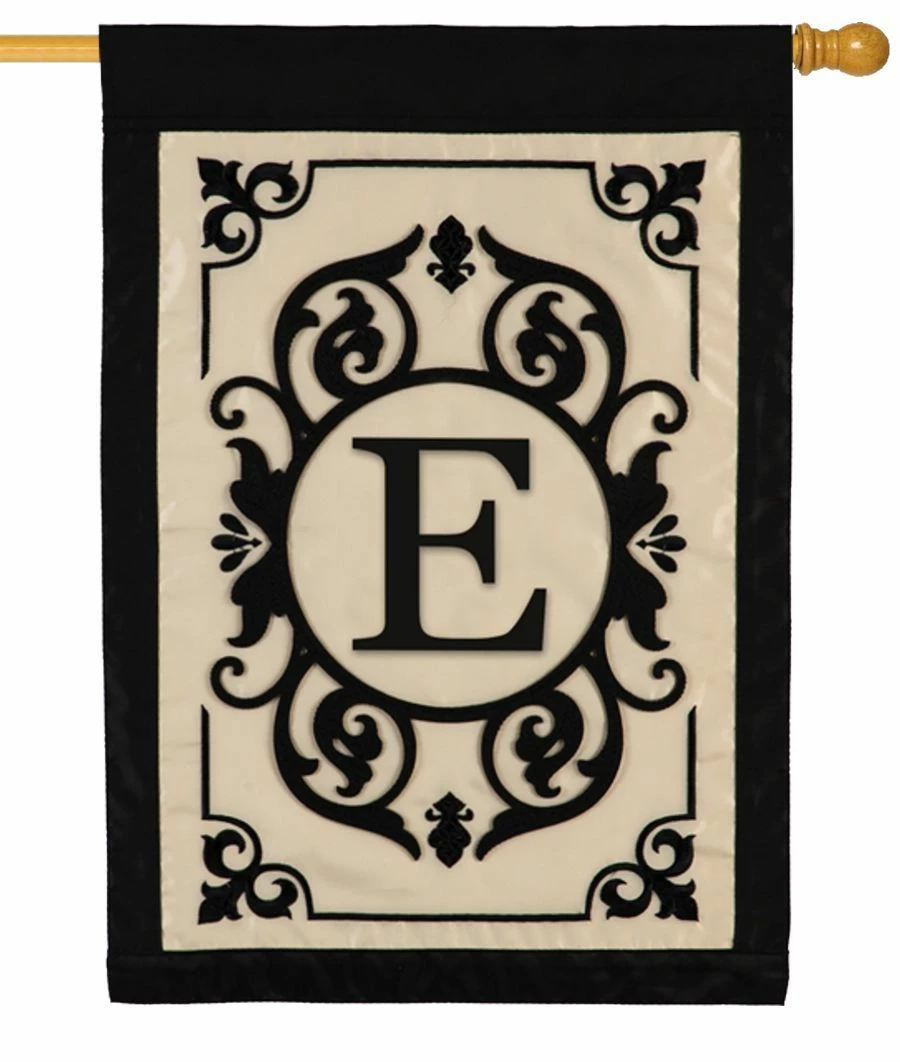 Elegant, decorative monogram house flag featuring a smartly designed monogram letter “E” sewn onto a crème colored, nylon fabric background and surrounded by ornate scroll work. The letter and the scroll design are both appliqued using a thick polyester material that looks and feels like felt. The four fleurs de lis in the corners of the design are heavily embroidered, while the entire design is framed with a black nylon border. All of the artwork is double sided so the letter reads correctly on both sides of the flag. What a rich looking, personalized touch to add to any outdoor landscape or indoor décor. Fits on any standard 5′ pole. Flag size 28″ x 44″