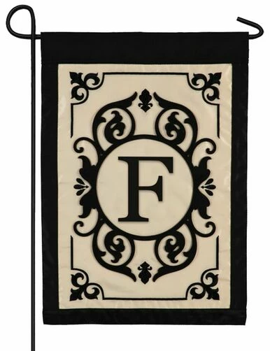 Elegant, decorative monogram garden flag featuring a smartly designed monogram letter “F” sewn onto a crème colored, nylon fabric background and surrounded by ornate scroll work. The letter and the scroll design are both appliqued using a thick polyester material that looks and feels like felt. The four fleurs de lis in the corners of the design are heavily embroidered, while the entire design is framed with a black nylon border. All of the artwork is double sided so the letter reads correctly on both sides of the flag. What a rich looking, personalized touch to add to any outdoor landscape or indoor décor. Fits on any garden pole. Flag size 12.5″ x 18″