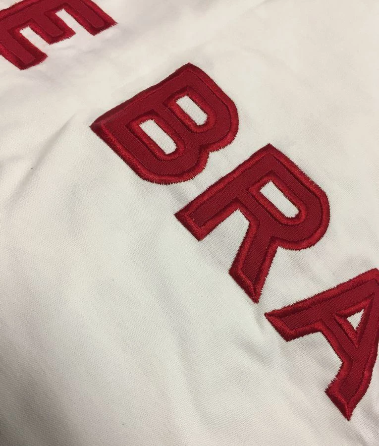 - Sewn panels with embroidered lettering and stars
