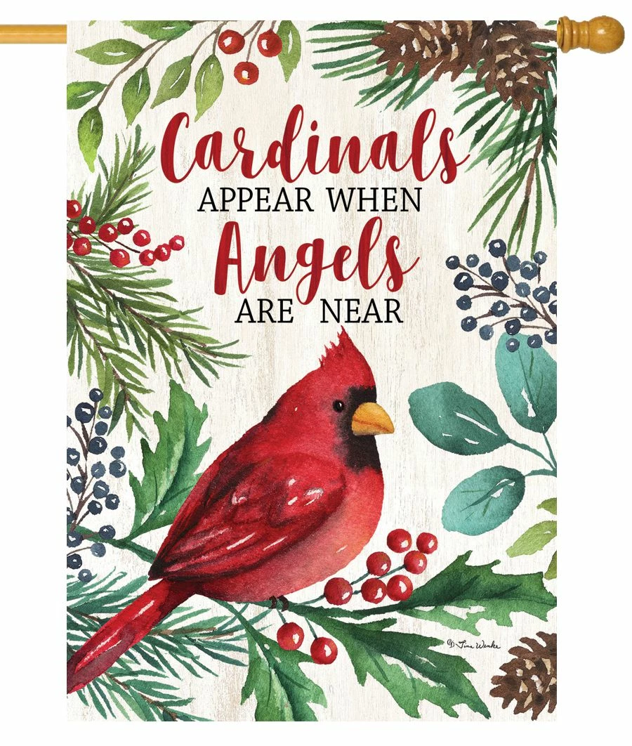 Share a beautiful message and image with everyone who comes to your Home or business during the Christmas season with this decorative house flag. The artwork shows a beautiful red male cardinal perched among an attractive arrangement of holly, pinecones, and evergreen. The message reads in the center, “Cardinals Appear When Angels Are Near” in red and black lettering above the redbird. The words read correctly from both sides of the flag. This gracious message and image shares with friends and loved ones your thoughts for the Holiday season through a decorative house flag. Artwork by Tina Wenke.